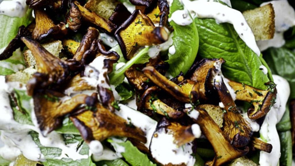 Huuhtele sienet ja salaatti. Kasaa salaatti tarjoiluastiaan tai lautasille pohjaksi.