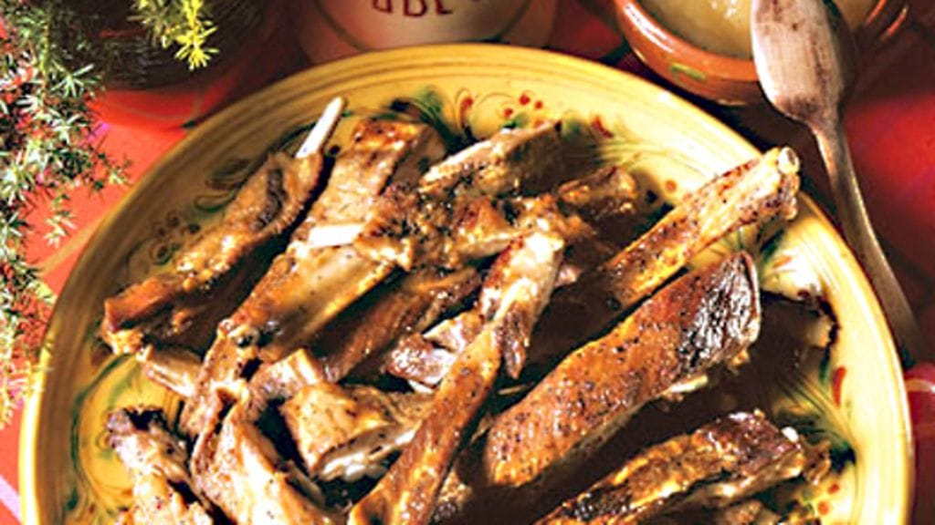 3. Jaa kylkiluut erilleen, tarjoile piparjuurella maustetun omenasoseen kera.