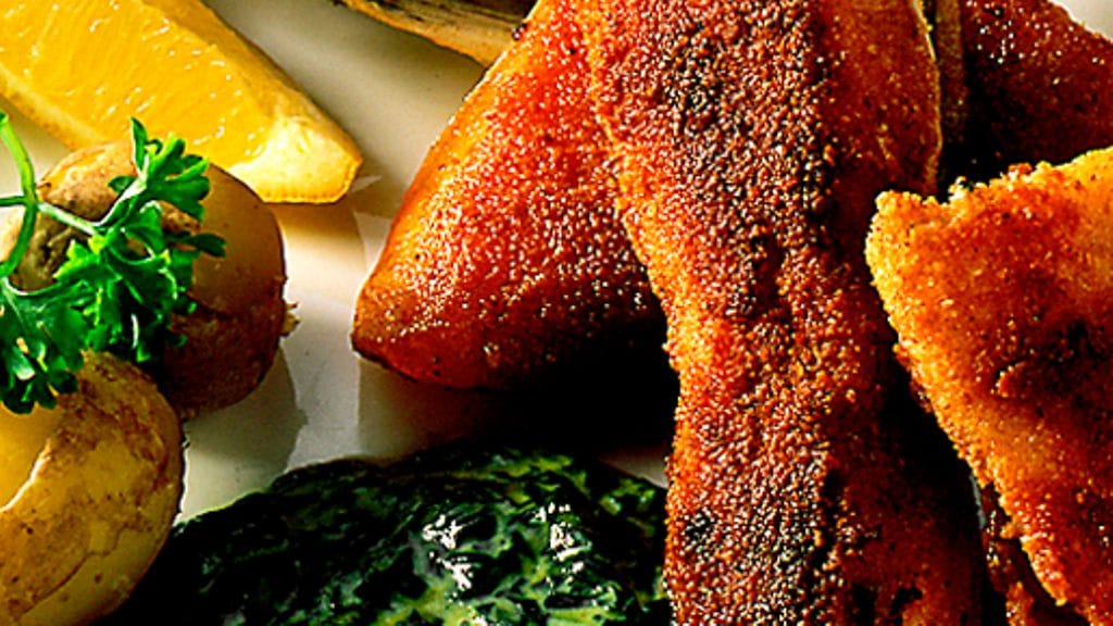 1. Vatkaa syvällä lautasella munien rakenne rikki. Mittaa myös vehnäjauho ja korppujauho kumpikin omalle syvälle lautaselleen. Sekoita suolaa ja pippuria korppujauhoihin. Kastele lohipalat ensin vehnäjauhoissa, sitten munassa ja lopuksi korppujauhoissa. Paista leivitettyjä paloja voissa, kunnes ne ovat kauniin kullanruskeita ja rapeita.