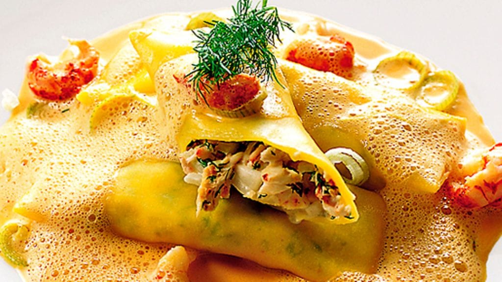 1. Levitä lasagnelevyt työpöydälle. Ota erilleen muutamia ravunpyrstöjä koristeluun. Silppua loput ravunpyrstöt. Kuori ja silppua salotit. Hienonna tilli sekä korianteri ja sekoita rapuhakkeeseen, lisää joukkoon toinen salottisipulin silppu ja ranskankerma, mausta suolalla ja pippurilla. Nosta nokare täytettä jokaiselle levylle ja kääri rullalle. Penslaa reunat munankeltuaisella ja taita reunat yhteen ikään kuin paketiksi. Kiinnitä cocktailtikulla.