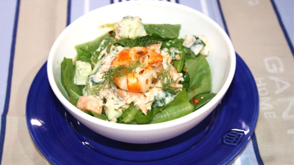 Hienonna scampit pyreeksi tehosekoittimessa. Lisää keltuaiset ja sinappi. Lisää öljyä ja etikkaa vuorotellen ja sekoita tasaiseksi massaksi. Lisää suola, katkaravut ja ranskankerma.