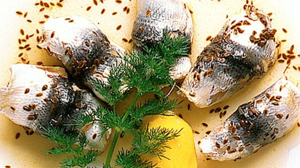 1. Käytä uuninkestävää vuokaa, älä liian suurta vaan sellaista, johon silakkarullat juuri ja juuri mahtuvat. Ripottele puolet tillinsiemenistä ja suolasta vuoan pohjalle. Leikkaa silakoista evät, rullaa ne nahkapuoli ulospäin ja asettele vuokaan. Lisää vettä niin että rullat juuri peittyvät. Ripottele päälle loput tillinsiemenet ja suola.
