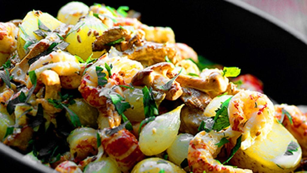 2. Kuutioi perunat. Hienonna persilja. Sekoita ravunpyrstöt, simpukat, hillosipulit, peruna ja persilja.
