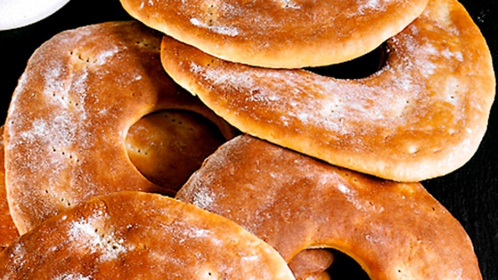 2. Vaivaa taikinaa leivinpöydällä. Jaa taikina kuuteen osaan ja kauli paloista pyöreitä matalia leipiä. Tee leipien keskelle muotilla reikä. Nosta aina kaksi leipää yhdelle leivinpaperin peittämälle pellille. Peitä leivät ja anna nousta noin 30 minuuttia.