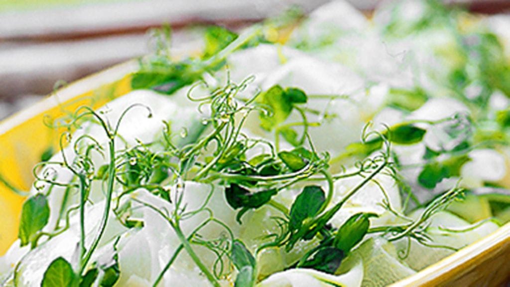 3. Valuta liemi pois, asettele retikka vadille ja koristele herneenversoilla.