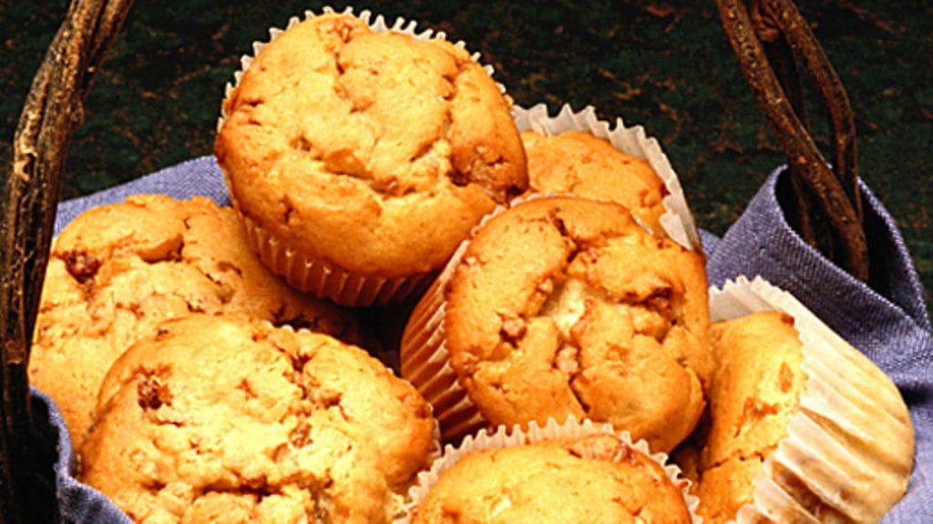 3. Kääntele jauhoseos munaseokseen, lisää viimeiseksi täyte. Lusikoi taikina muffinivuokiin. Sekoita sokeri ja kaneli, ripottele päälle. Paista 15-20 minuuttia uunin alatasolla.