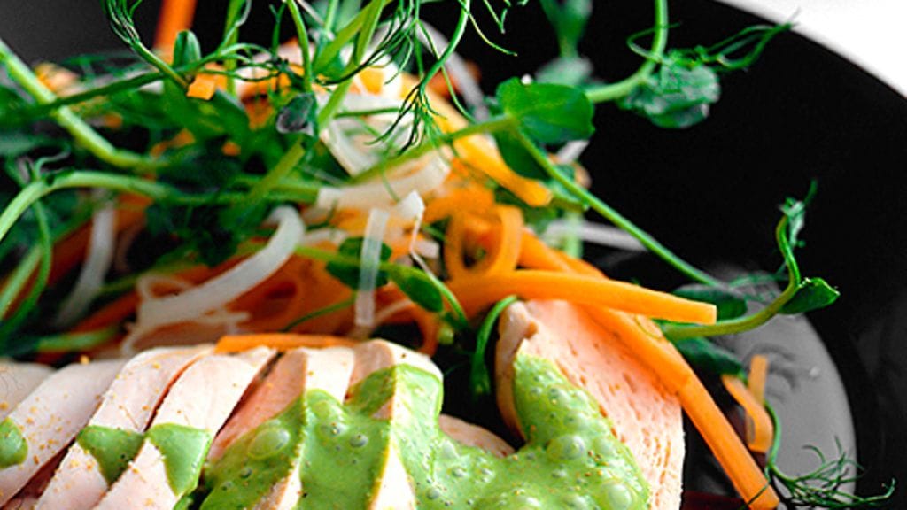2. Toinen päivä: Keitä vettä isossa kattilassa, nosta broilerinpuolikkaat kattilaan ja katso, että vesi peittää lihat. Lisää peratut kasvikset, pippurit, laakerinlehti, timjami ja pari persiljanoksaa. Kuumenna uudelleen kiehuvaksi ja keitä hiljaisella lämmöllä 40-50 minuuttia. Kokeile broilerin reidestä, että lihaneste on kirkasta. Nosta broileri kattilasta, vedä nahka irti ja erottele liha luista ja leikkaa viipaleiksi ennen tarjoilua.