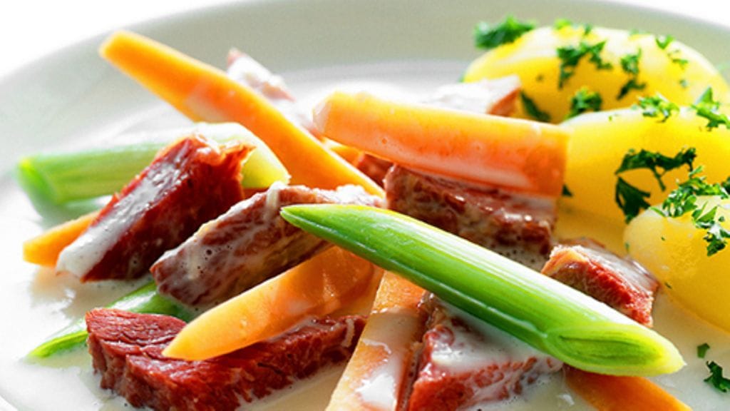 2. Huuhdo purjo ja leikkaa se palasiksi, kuori porkkanat ja paloittele. Säästä 3 dl keitinlientä kastiketta varten, kuumenna loput kiehuvaksi ja keitä porkkanat ja purjo pehmeiksi. Pidä ne lämpiminä. Kiehauta kerma ja 3 dl lientä sinapin ja piparjuuriraasteen kanssa.
