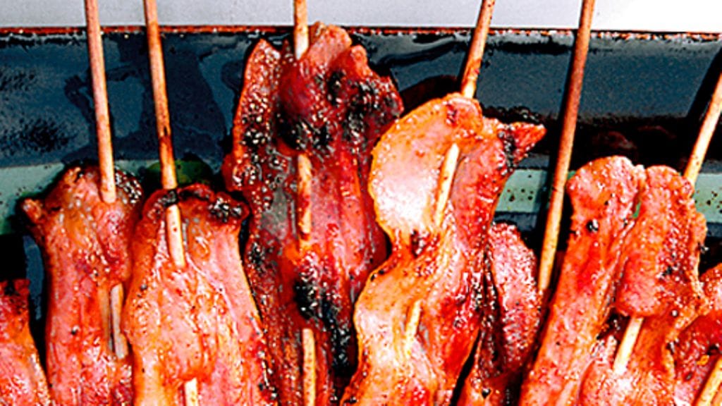 2. Leikkaa kamara pois läskiviipaleista ja pujota viipaleet grillitikkuihin pitkittäin. Anna grillihiilten palaa, niin että pinta on tuhkanharmaa. Tuuleta hiilipesää niin, että saat nokihiukkaset pois ja laita vasta sitten grilliritilä paikoilleen. Laita vartaat ritilälle ja sulje grillin kansi. Tuuletusaukot sekä pohjassa että kannessa pitää olla auki. Käännä vartaat 1-2 minuutin päästä.
