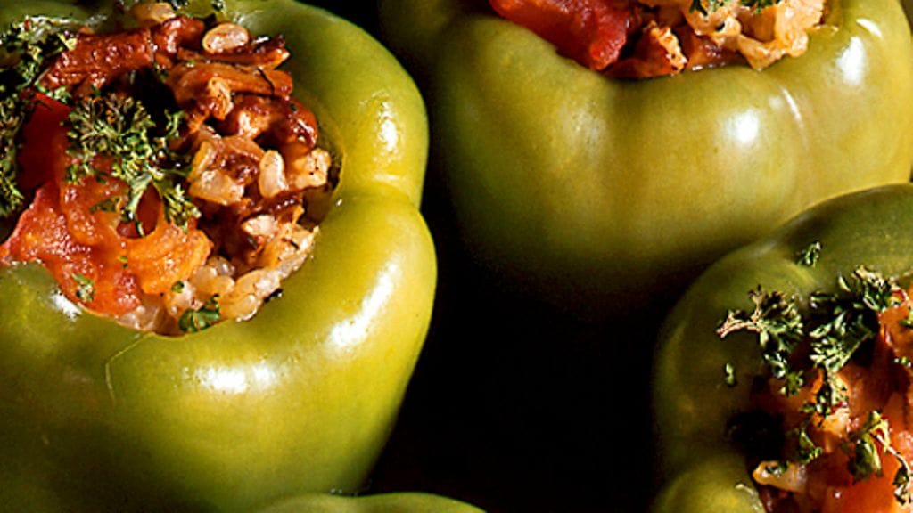 3. Sekoita riisiin persilja ja tomaatit. Täytä paprikat. Kaada loput liemestä vuokaan ja laita vuoka uunin keskitasolle kunnes paprikat pehmenevät.