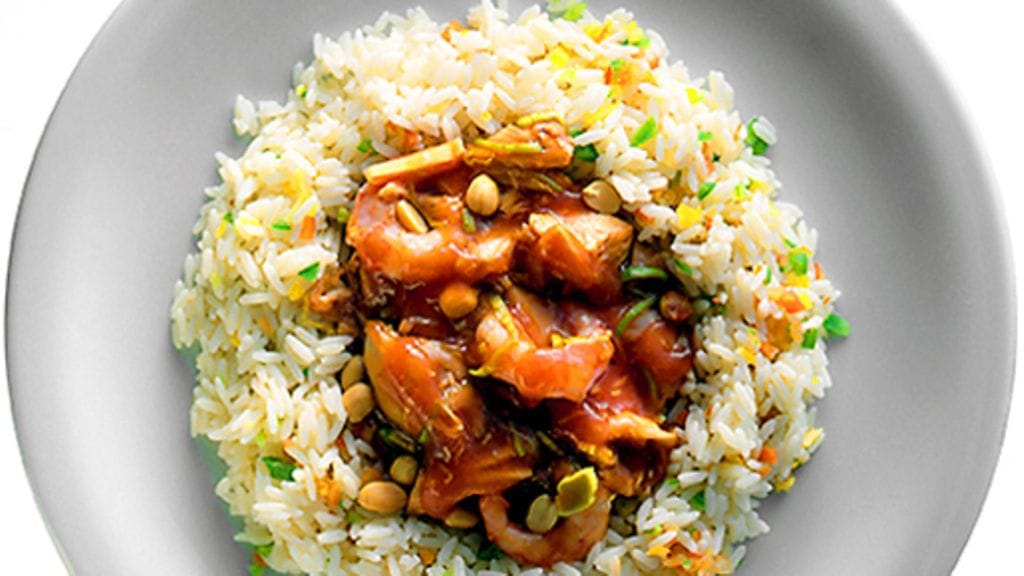 3. Lisää lihapalat liemeen ja lämmitä kauttaaltaan. Jaa riisi neljälle lautaselle, nosta päälle broilerinpalat ja jaa päällimmäiseksi katkaravut.