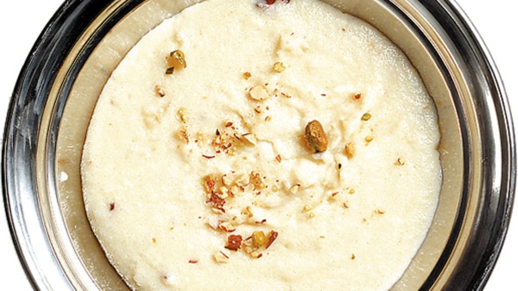 2. Lisää maitoon sokeri ja riisijauhot vähän kerrallaan ja voimakkaasti vatkaten, ettei seos kokkaroidu. Keitä seosta koko ajan vatkaten, kunnes se saostuu. Siirrä kattila levyltä ja sekoita mukaan kardemumma.