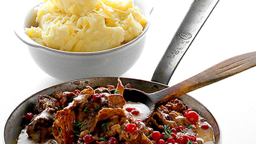 3. Anna käristyslihojen sulaa puolittain ja suikaloi ne. Kuori ja hienonna sipuli. Kuullota sipulihake voissa ja nosta sitten pannulta. Paista vuorostaan voissa käristyslihat, lisää vähän kerrallaan, ettei pannu jäähdy liikaa. Sirottele päälle jauhoa ja sekoita. Pane sipulisilppu takaisin pannulle, lisää kantarellit ja kaada kerma päälle. Anna porista 5 minuuttia ja mausta soijalla, suolalla ja pippurilla. Koristele timjamilla ja puolukoilla. Tarjoile muusin kanssa. Höylää perunasoseen pinnalle parmesaanilastuja ennen kuin tuot sen pöytään.