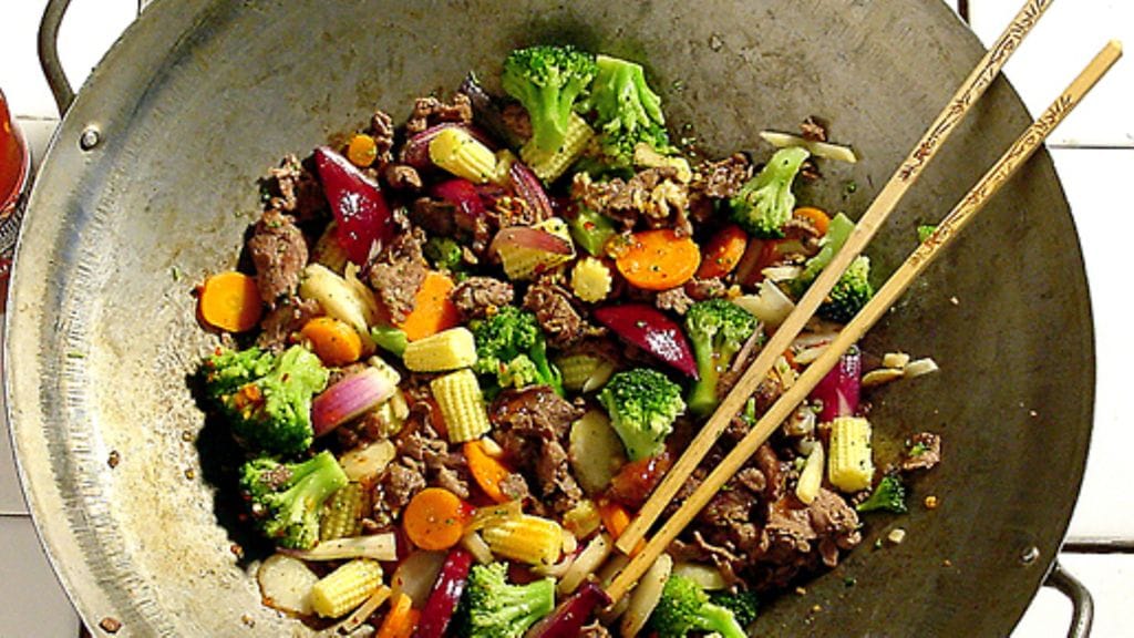2. Kuori ja lohko punasipuli. Kuumenna öljy wokkipannussa. Laita riistakäristys wokkiin, anna sen sulaa ja paistua välillä käännellen ja irrotellen käristyspaloja. Loppua kohden lisää sipulilohkot.