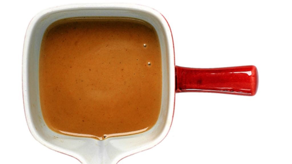 3. Anna kastikkeen kiehua hiljalleen samalla sekoittaen 15 minuuttia. Mausta hyytelöllä, suolalla ja pippurilla. Siivilöi.