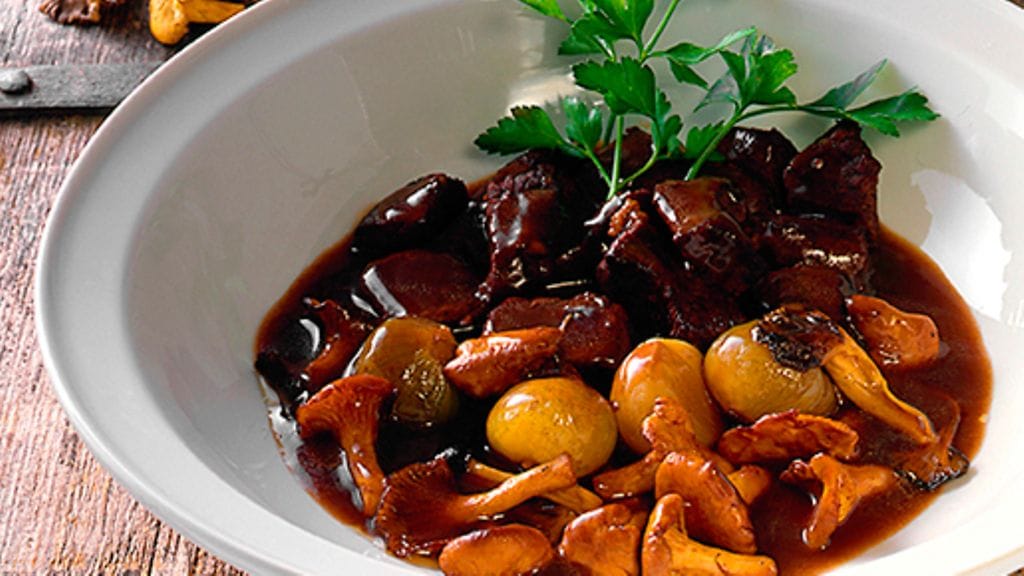 1. Leikkaa liha kuutioiksi. Kuori pikkusipulit ja ruskista ne voissa. Nosta pataan. Paista lihakuutiot erissä ja mausta suolalla ja pippurilla. Siirrä paistetut lihakuutiot pataan, ripottele päälle vehnäjauhoa ja sekoita kunnolla.