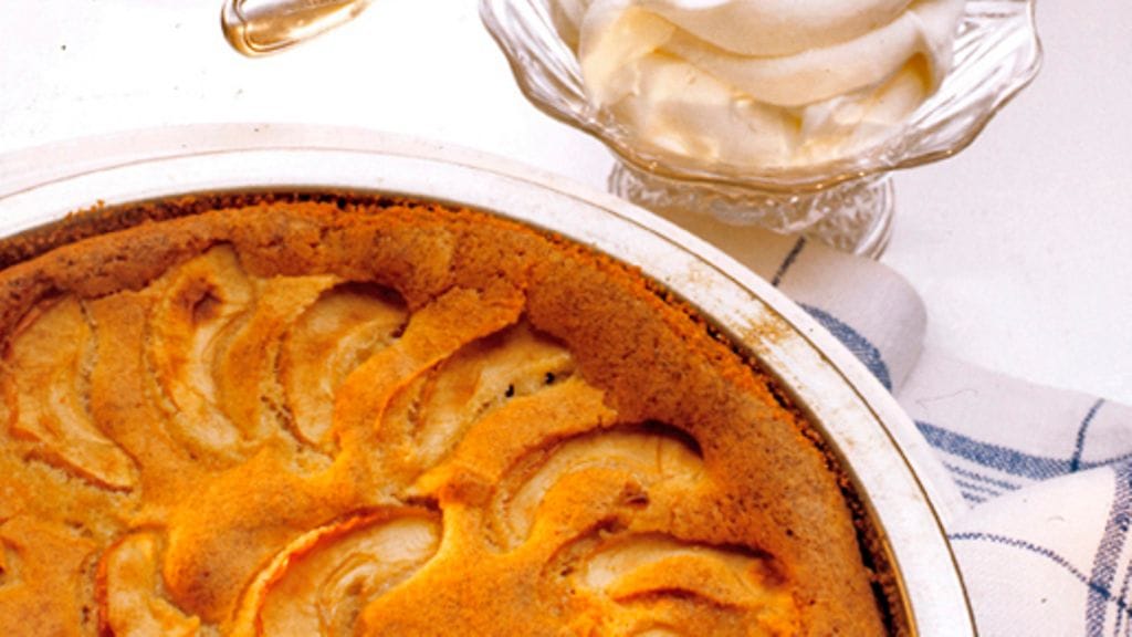 2. Älä kuori omenoita, paloittele ne vain lohkoiksi ja asettele kauniiksi kuvioksi taikinan päälle. Paista 175-asteisessa uunissa 35-40 minuuttia.