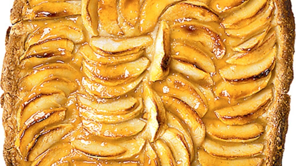 1. Kuumenna uuni 200 asteeseen. Mittaa jauhot kulhoon, lisää paloiteltu voi ja nypi murumaiseksi seokseksi. Lisää sokeri ja sekoita. Lisää munat ja vaivaa taikinaksi. Kuori ja poista siemenkodat. Leikkaa omenat ohuiksi viipaleiksi. Kauli taikina leivinpaperilla päällystetylle pellille, niin että taikina nousee hieman reunoille.