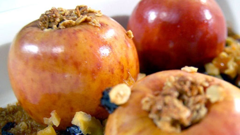 Koverra omenoista siemenkota pois ja täytä se myslillä. Nosta täytetyt omenat annosvuokaan, peitä kannella ja kypsennä uunissa 200 asteessa 30 minuutin ajan.