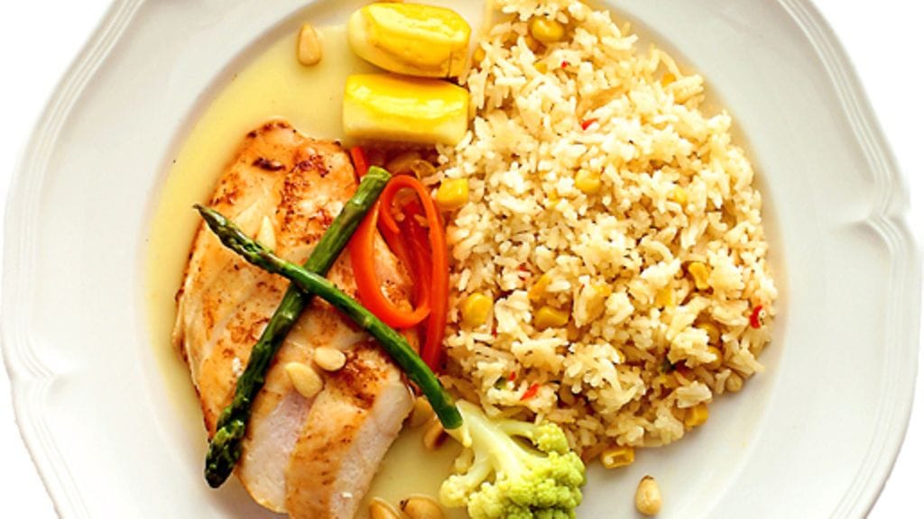 3. Viipaloi broileri ja aseta lautasille. Nosta päälle parsaa ja romanescoa. Koristele pinjansiemenillä ja porkkanasuikaleilla. Tarjoile lisänä maissiriisiä.