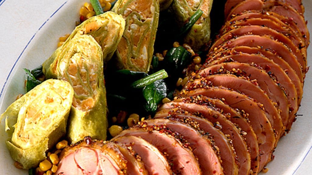 1. Kuumenna uuni 175 asteeseen. Hiero paistin pintaan valkopippuria, murskattuja rosépippureita ja suolaa. Paina paistolämpömittari lihan paksuimpaan kohtaan ja aseta paisti uunipannulle. Pane muutama nokare voita paistin pinnalle ja kaada 2 dl vettä pannulle. Kypsytä paistia uunissa 1 ½ - 2 tuntia. Kun paistin sisälämpötila on 70 -72 astetta se on rosaa sisältä, 77 asteessa se on läpikypsää. Ota paisti uunissa ja anna sen vetäytyä alumiinifoliossa.