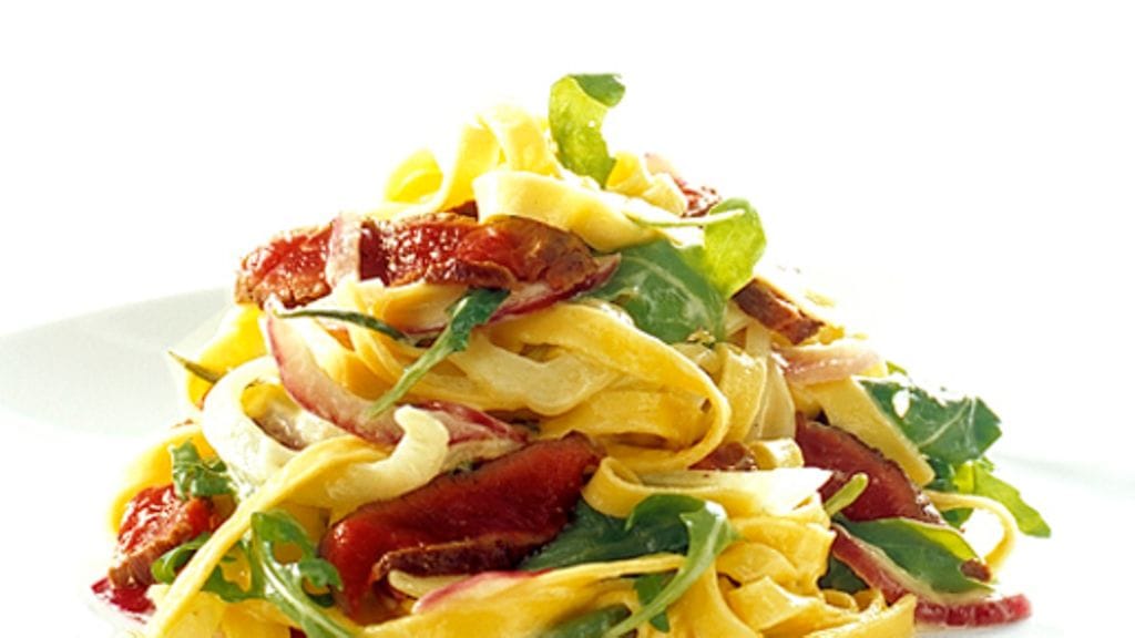 3. Kuullota sipuli ja fenkoli pehmeiksi. Lisää kerma ja kasvisliemi ja keitä 10 minuuttia. Lisää vastakeitetty pasta ja sekoita. Kääntele joukkoon rucola. Leikkaa lampaanfilee ohuiksi viipaleiksi ja tarjoa pastan kera.