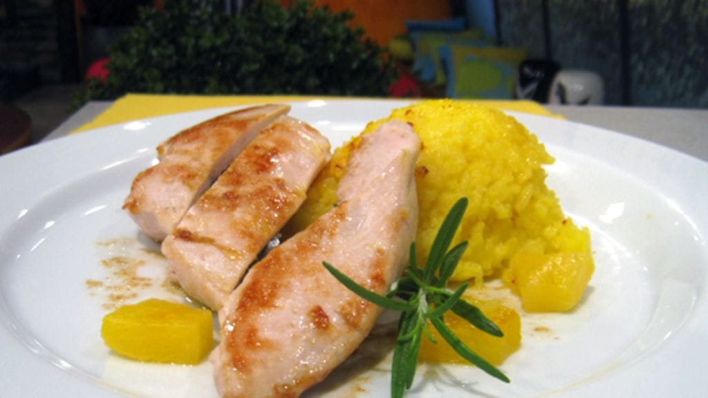 Leikkaa broilerinfileeseen onkalo ja täytä se rosmariinin lehdillä. Tunge lehtien sekaan voita ja mausta rinnat suolalla. Paista rinnat kypsiksi ja tarjoa ananasriisin kera.