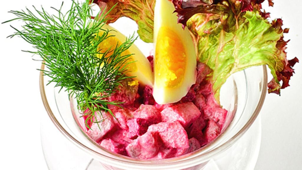 1. Kuori omena. Kuutioi silli, punajuuret, omena, sipuli, suolakurkku ja perunat hienosti.