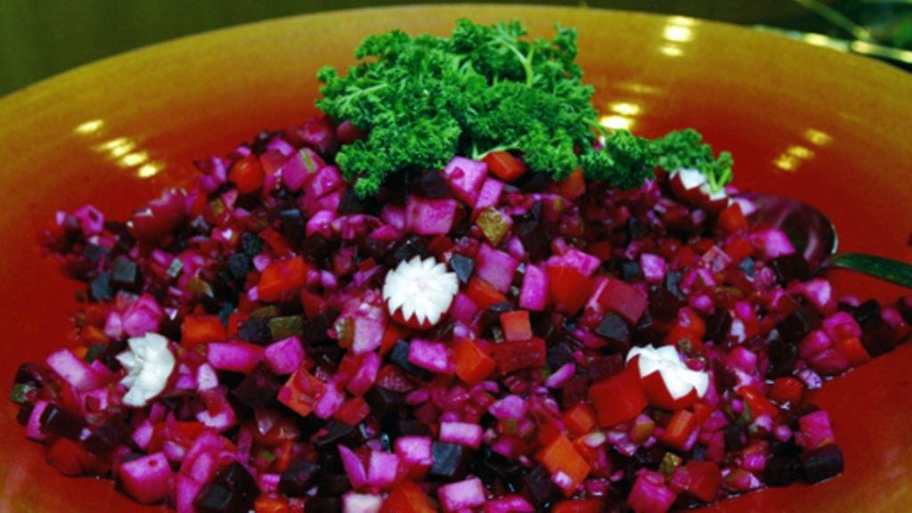 Suikaloi porkkanat, punajuuret, maustekurkut sekä omena. Paloittele sipulirouskut. Asettele ainekset omiksi ryhmikseen tarjoiluvadille.
