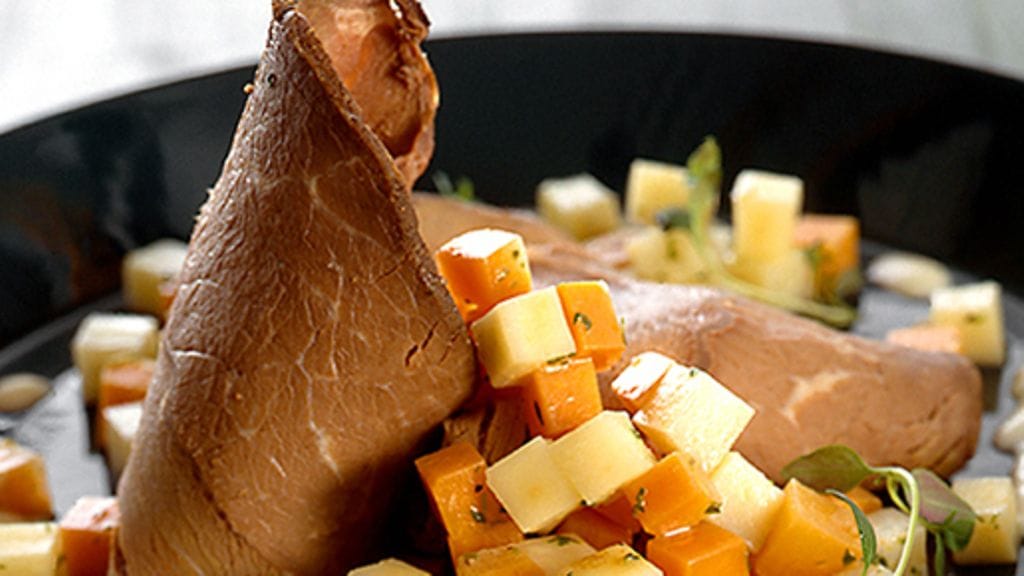 3. Kuori lanttu, selleri, palsternakat, porkkanat ja perunat ja leikkaa ne tasakokoisiksi kuutioiksi. Paista juurekset pehmeiksi voissa, noin 10 minuuttia. Silppua persilja, lisää se pyttipannuun, samoin suolaa ja sokeria, sekoita huolella, pidä lämpimänä. Ota liha suolaliemestä ja kuivaa se. Leikkaa se ohuiksi viipaleiksi ja tarjoa pyttipannun kanssa.