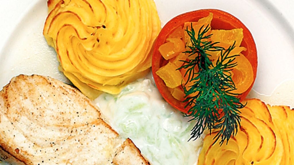 3. Kuivaa ja paista kalafileet molemmin puolin voissa. Mausta suolalla ja pippurilla. Tarjoile täytettyjen tomaattien ja tsatsikin kera.