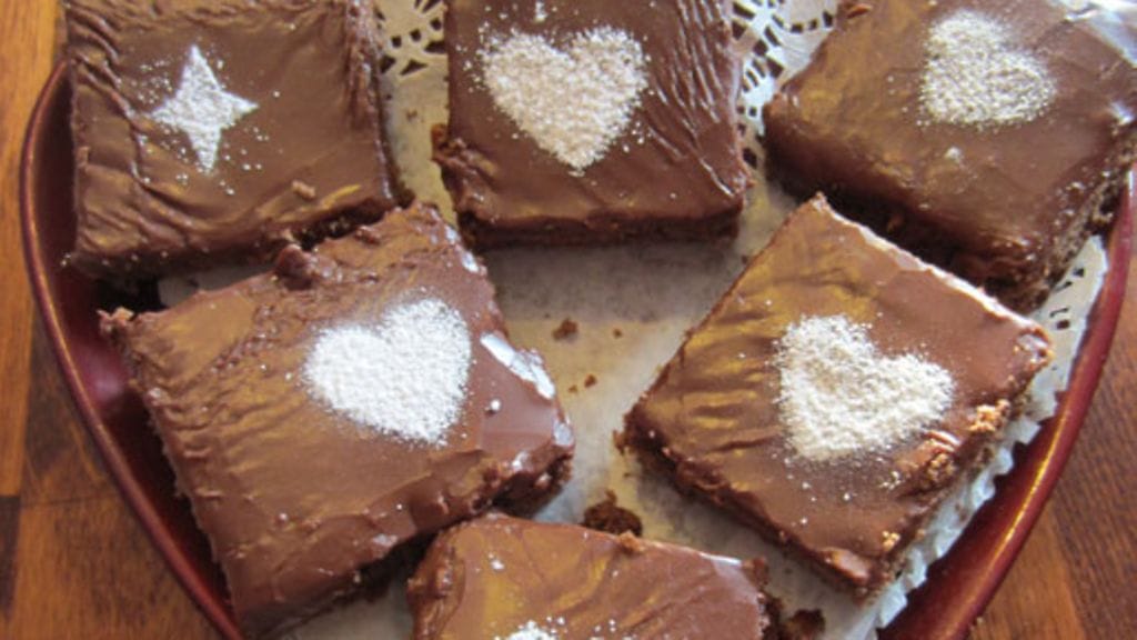3. Sekoita täytteen aineet tasaiseksi, katso että täyte on paksua, mutta juoksevaa. Levitä se lämpimälle torttupohjalle kuorrutteeksi. Anna jäähtyä. Leikkaa jäähtyneenä n. 7 x 7 cm neliöiksi terävällä veitsellä. Jos kuorrute tarttuu veitseen, kostuta se välillä kuumassa vedessä. Leikkaa leivinpaperipalaan n. 3 cm:n kokoinen sydämen muotoinen reikä, sihtaa sen avulla leivoksille koristelu.
