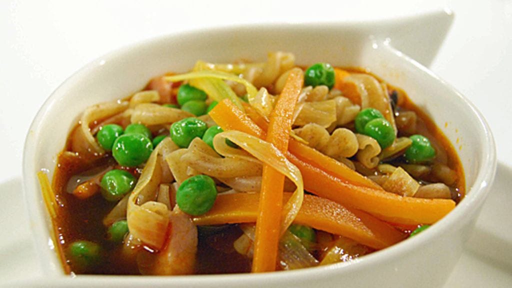 Keitä 15 minuutin ajan, lisää joukkoon ruispasta ja keitä kunnes pasta on kypsää. Lisää herneet, tarkista maku ja viimeistele keitto esimerkiksi tuoreella yrtillä. Tarvittaessa lisää nestettä.