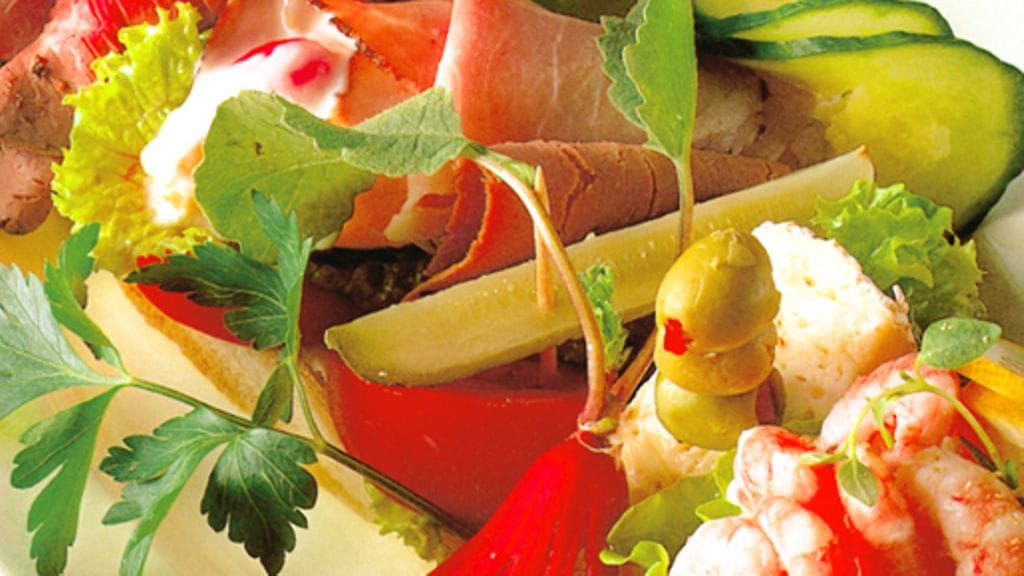 2. Asettele ainekset kauniisti leiville: puolikas kananmuna, joka leivälle, koristeltuna kuudella katkaravulla ja sitruunaviipaleella. Seuraavaksi pane leiville jälkiruokajuusto oliivi-hammastikun kera. Leikkaa retiisit kauniisti ja pane sitten leivän päälle.