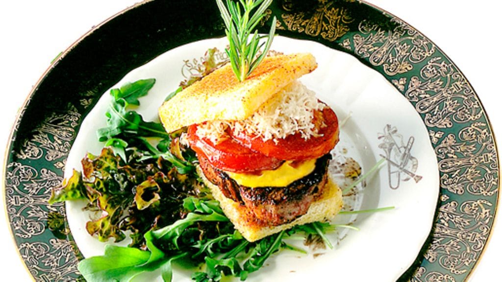 2. Leikkaa tomaatti neljäksi viipaleeksi ja paista tai grillaa viipaleet nopeasti kuumalla pannulla. Paista tai grillaa häränfileet medium-kypsiksi noin kaksi minuuttia kummaltakin puolelta. Nosta neljä paistettua leipäviipaletta omille lautasilleen. Pane kullekin leivälle siivu häränfileetä.