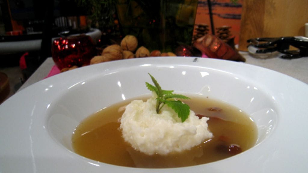 Tarkista keiton makeus ja lisäile sokeria tarpeen mukaan. Sekoita perunajauhot tilkkaan kylmää vettä ja lisää keiton joukkoon. Anna kuumeta kiehumispisteeseen ja kaada soppa sitten tarjoilukulhoon jäähtymään.