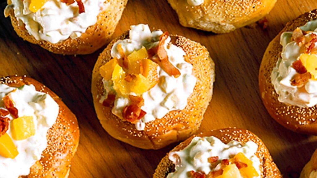 3. Lämmitä sämpylöitä hetki uunissa, leikkaa niistä kansi ja koverra vähän sisustaa pois. Täytä sämpylät, koristele pekonilla ja muutamalla hedelmäpalalla.