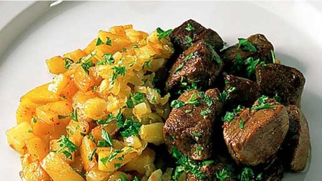 2. Suolaa ja pippuroi lihat ja paista nopeasti kuumalla pannulla, niin että jokainen kuutio saa paistopintaa mutta on sisältä verinen. Älä laita liikaa lihaa pannulle kerralla, silloin lihat keittyvät ruskistumisen sijaan.