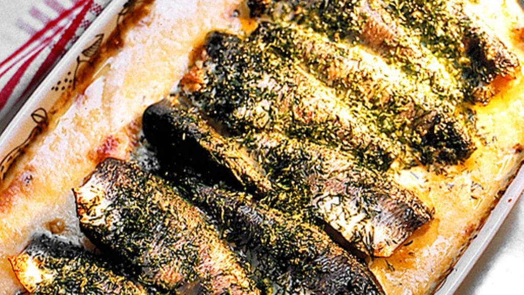 3. Sekoita kerma, anjovisliemi ja tilli ja kaada silakoiden päälle. Ripottele pinnalle korppujauhot, suolaa ja ripaus valkopippuria. Kuumenna uuni 200-225 asteeseen ja kypsennä 20-25 minuuttia.