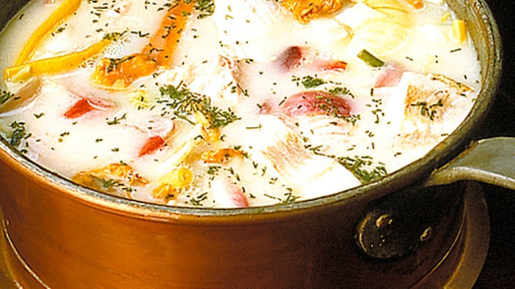 1. Perkaa ja fileoi kala. Keitä liemi ruodoista, päästä ja nahasta: lisää näiden päälle kattilaan litra vettä, porkkana, purjo, suola, valkopippurit, tillinsiemenet ja kajennepippuri. Keitä hiljalleen 25-30 minuuttia, kuori vaahto. Siivilöi liemi ja keitä kokoon, kunnes jäljellä on n. 7 dl.