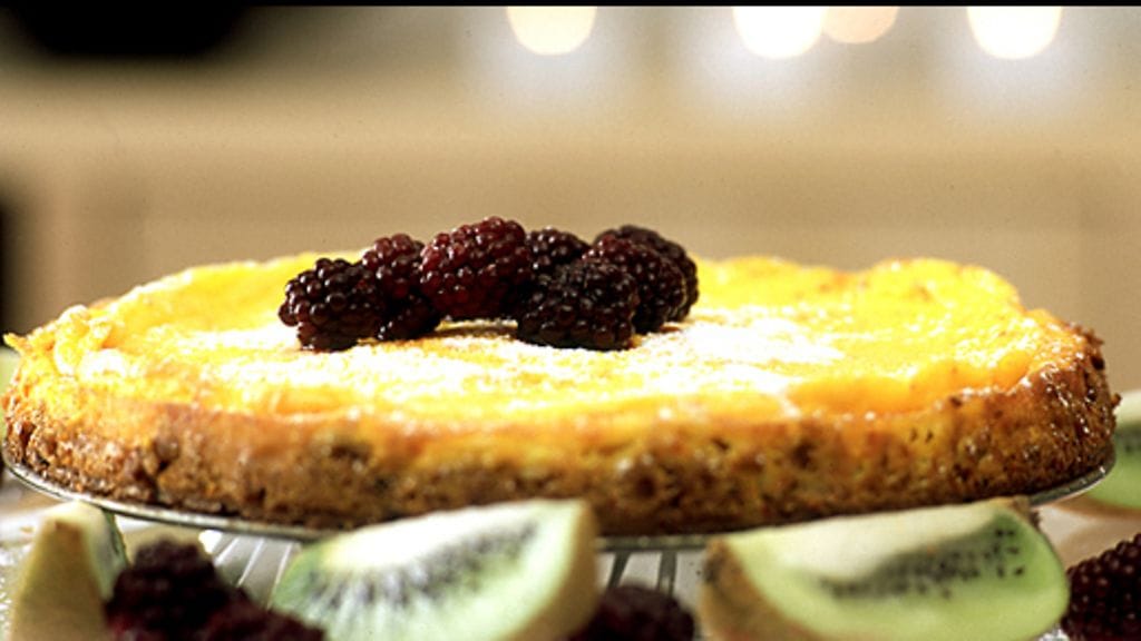 3. Sirottele kakun päälle tomusokeria ja tarjoa kakku sulatettujen, kevyesti sokeroitujen karhunvatukoiden tai muiden marjojen kanssa.