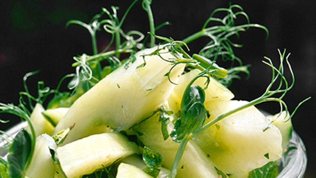 1. Kuori kurkku ja paloittele tangoiksi tai paloiksi. Laita kurkunpalat vadille ja ripottele päälle suola.