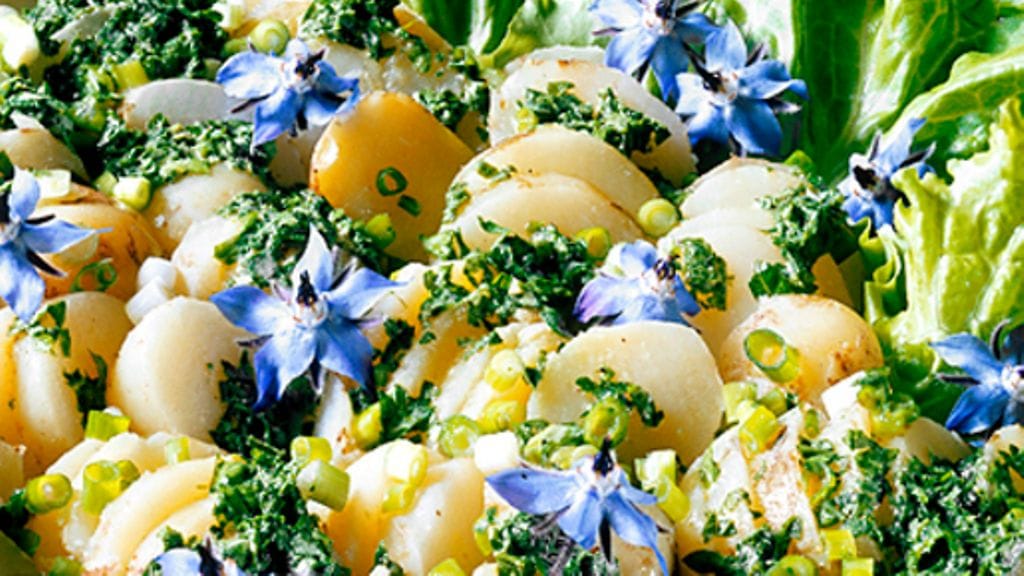 Maukas perunasalaatti, joka esimerkiksi voi koristaa juhannuspöytää syötävine kukkineen koristeena.