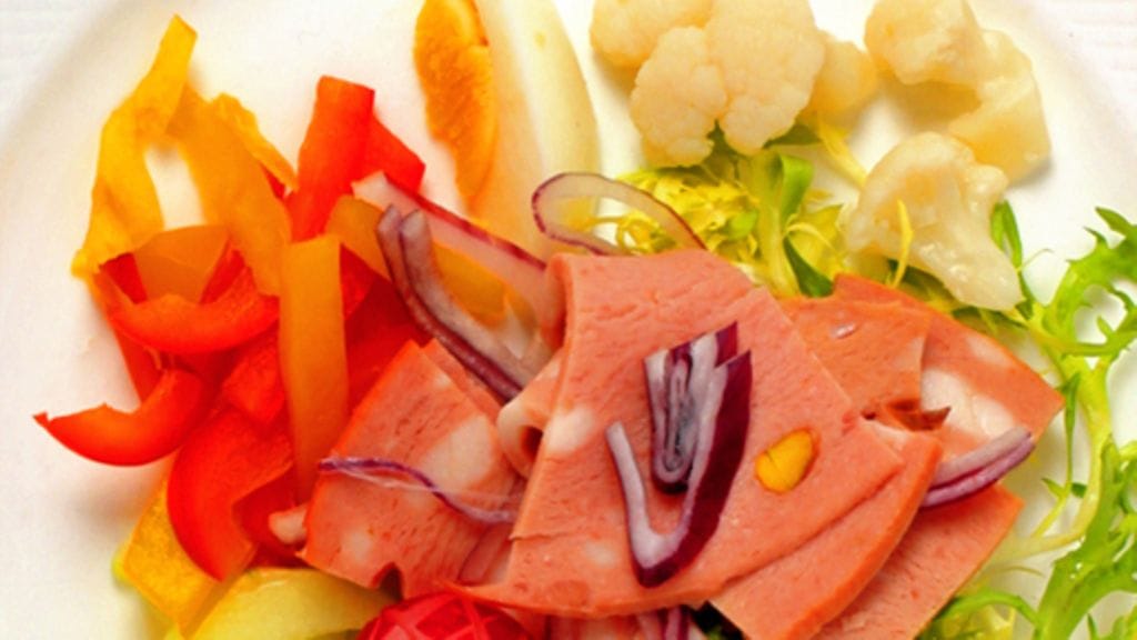 3. Asettele kasvikset ja munalohkot kauniisti lautasille. Koristele mortadellapaloilla ja pirskottele päälle sitruunakastiketta.