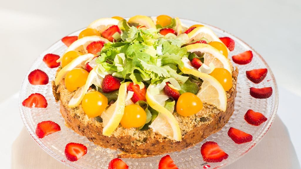 7. Aseta kakku tarjoilualustalle ja koristele. Voit esimerkiksi laittaa reunoille mansikka-sydämet, sitruunaviipaleet ja kirsikkatomaatit 12 palaselle. Valitsemasi salaattikasan voit sijoittaa vaikkapa keskelle kakkua. Tarjoile feta-jugurtti kastikkeen kanssa (sekoita kastikkeen ainekset yhteen).