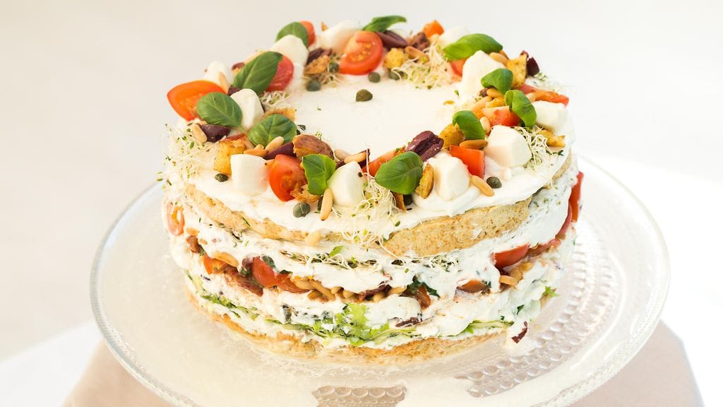 – Yrttinen soodaleipä ja kerroksittain välimerellisiä täytteitä. Eri täytteet sidotaan toisiinsa tuorejuusto-jogurttitahnan avulla, jotta kakku pysyy kasassa leikatessa. Kokoa kakku kerroksittain rengasvuokaan, kuten voileipäkakku. Päälle ja alle tulee leipä, väliin vuorokerroksin tuorejuusto-jogurttitahnaa ja täytteet. Kukin täyte muodostaa oman kerroksensa ja tuorejuusto-jogurttitahna toimii ”leipänä”. Salaattikakku on kuin vähemmän leipää sisältävä voileipäkakku, Jaana kertoo.