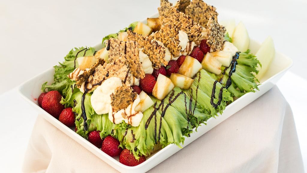 5. Kokoa kakku; leikkaa pohja kahteen osaan. Laita salaattitäytteitä väliin ja toinen leipä päälle. Kuorruta vuohenjuustovaahdolla. Koristele salaateilla ja mansikoilla ja näkkärillä, huljuta päälle kastiketta.