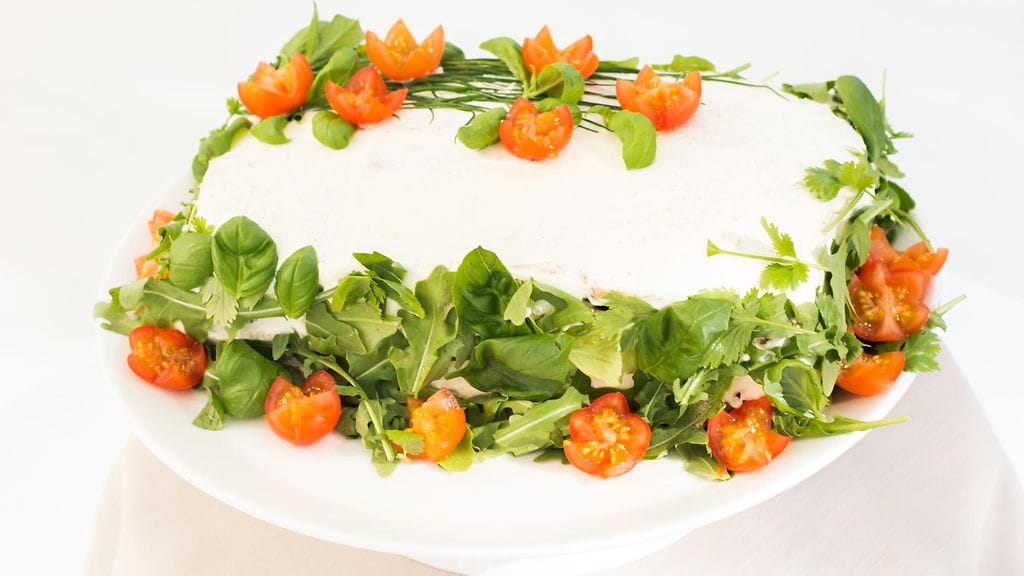 Yhteen kerrokseen tulee aina 6 viipaletta leipää. Kostuta leivät sitruunamehulla. Voitele dijonsinapilla. Sekoita tuorejuusto ja ranskankerma ja mausta mausteilla. Lisää halutessa dijonsinappia. Pilko sipuli, kurkku ja tomaatit. Sekoita lohi ja sipuli tuorejuustoranskankermaseoksen kanssa sekaisin. Levitä seos ensimmäisen kerroksen väliin. Lisää myös tilli. Levitä toiseen kerrokseen hummus, vihanneksia ja rucola. Koristele kakku ruohosipulilla ja kirsikkatomaateilla.