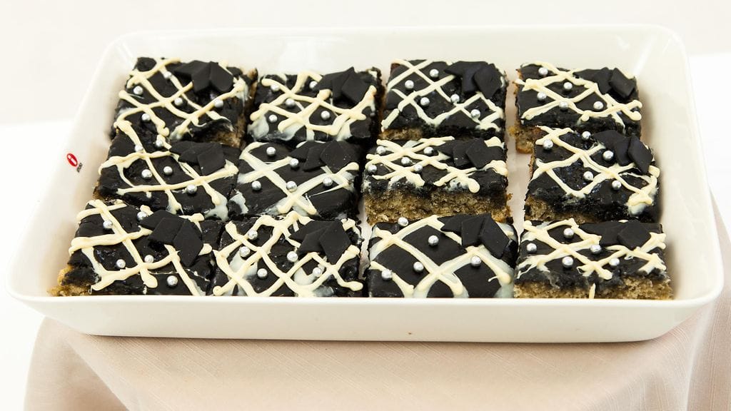 6. Ota torttu pois uunista. Irrota vuoka tortusta. Jäähdytä torttu. Kun torttu on jäähtynyt, päällystä se salmiakkikuorrutteella. Levitä kuorrute pohjan päälle varovasti ohuella lastalla.