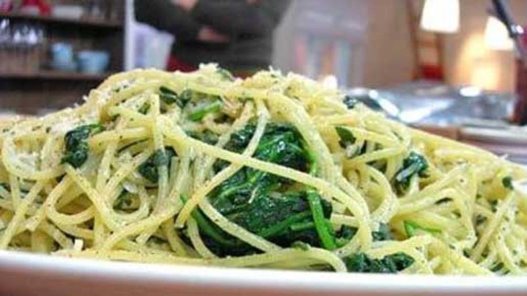 Leikkaa salvia ja valkosipuli hienoksi. Pese pinaatti hyvin ja ruodi se jos lehtiruoti on paksu. Kuullota valkosipulit, salvia ja pinaatti nokareessa voita. Keitä spagetti kypsäksi ja valuta se. Lisää pannulle muiden raaka-aineiden joukkoon ja sekoita. Mausta lopuksi suolalla, mustapippurilla ja parmesan-raasteella. Tarjoile heti.